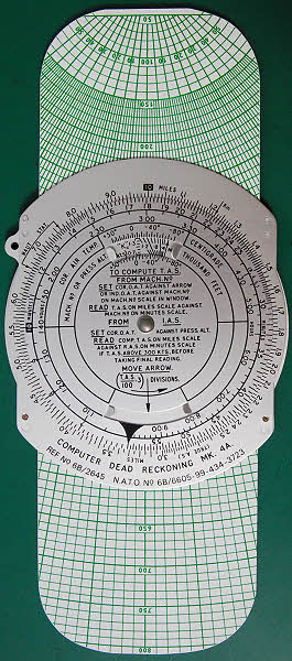 Computer Dead Reckoning Mk 4A Ref No 68/2645 NATO No 68/6605-99-434-3723 made by the London Nameplate Mfg Co Ltd. The circular calculator on the front face is for finding True Air Speed from either Mach No or Indicated Air Speed. The rear face, used with the slide, is for determining the course variation due to the wind. This would have been made for the RAF. I also have the Computer Dead Reckoning Mk 4B (minus slide) that was intended for slower aircraft.