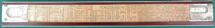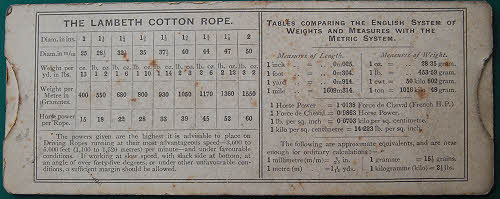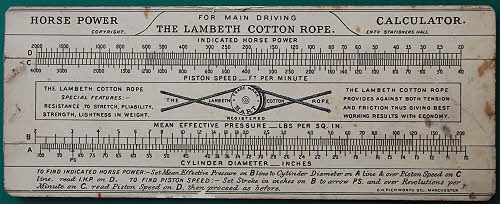 The Lambeth Cotton Rope Horse Power Calculator for main driving. This 6.3” LOA cardboard slide rule was used to calculate the indicated HP of the driving steam engine given its cylinder dimensions, mean effective pressure and speed. The table on the reverse gives the weight of different diameters of rope and the horse power they could transmit. There is also a table of metric size and weight equivalents. Probably early 20th century. Thomas Hart was the firm that made Lambeth ropes.