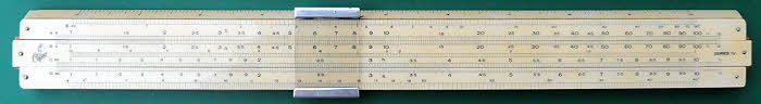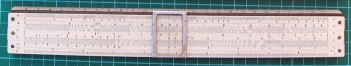 Simplon Duplex 10” slide rule made by Dargue Bros ca.1946. This has two cursor grooves along the edges so the cursor can be reversed as shown in the second picture. The scales are: A{B,C}D//A,S,L,T,D. Unlike the 10” Bilateral it has no log log scales. It has a black card case and instructions, both of which are in poor condition.