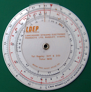 Platt Count Converter and circular slide rule. The upper side is a conventional circular slide rule with scales as follows: L,D{C,C1,A,K}. The reverse has scales for five different types of cloth count to enable conversion between them. Diameter 3”. It has an instruction booklet (printed in Dorchester) and a PVC slip case. The actual manufacturer is not stated. Platt was an Accrington (Lancashire) firm which is a long way from where the instructions were printed. Was the maker a Dorset one (Abbott Brown or Blundell perhaps)?