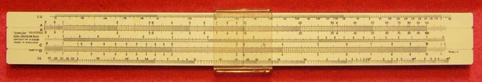 A Simplon Bilateral slide rule made by Dargue Bros of Halifax (1934 patent). It dates from the mid-twentieth century. This model was introduced in 1935 when it sold for 7/6. It is a ten inch duplex (double sided) rule made of plastic faced mahogany. Unusually, there are two cursor grooves along each edge of the rule and the cursor has to be removed and put on the other side to use the scales on the reverse. Scales are: LU,A{B,C1,C}D,LL//A,S,L,T,D. Maroon card case.