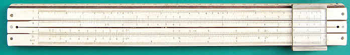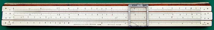 J Halden & Co “Davis-Scurfield Split Unit” slide rule. 10” steel backed mahogany & celluloid construction, it has brown card case. G Scurfield patent 227643 of 1925; this rule was a presented to Thomas Ivor Jones in 1926. Scales are: cm\S,A{B,T,C}D,L,SU\in. The split unit (SU) scale was for use in non-decimal (e.g.Sterling currency) calculations and similar, the 20 major divisions being suitable for shillings, these being further divided for pennies and half-pennies. The slide rule is described in some detail in the mid-1920s Halden catalogue, page 116. It was made by John Davis & Son (Derby) Ltd who adopted Scurfield’s patent.