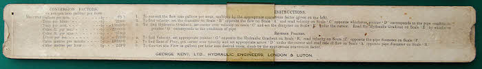 Kent’s hydraulic slide rule for calculating hydraulic gradient from the flow, pipe diameter, and velocity for water. Cardboard, approximately 10” LOA with a brown cloth covered card case. The instructions for its use are on the reverse. George Kent & Co were makers of water flow meters for waterworks and also made planimeters, an example of which can be seen on my planimeters page.