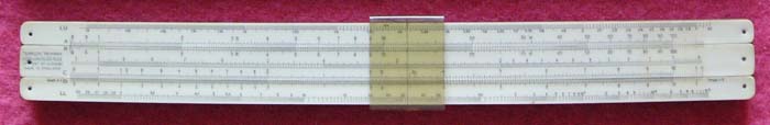 The Technical Standard Slide Rule. Closed frame, ten inch mahogany & celluloid with unusual cursor windows on the reverse, plus tables. Scales are: M,A{B,C}D,N//{S,ST,T}. (M & N are usually denoted LU & LL or LL2 & LL3). Made by the British Slide Rule Co, a subsidiary of Marine & Overseas.