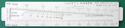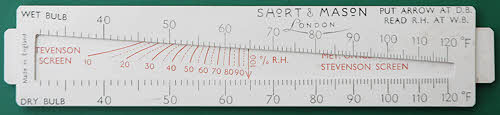 Short & Mason psychometric slide rule for calculating relative humidity. It has a reversible slide, one side for sling/Assman calculations and the other for Stevenson’s Screen. It has an instruction leaflet and a brown PVC slip case.