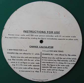 Coombes Chnage Calculator made by Smith’s Calculators, Beaminster, Dorset. 4” diameter plastic calculator. Patent application no. 3163/67. In 1968 the first decimal coins in the UK appeared in circulation, the nickel-silver 5p and 10p (p = new pence). These were the same weight and size as the one and two shilling pieces and interchangeable with them. A new 50p coin was also introduced to replace the ten shilling note. Until 1971 when the remaining ‘new pence’ coins were issued, there were both £sd and decimal coins in circulation and goods might also be priced in either. The purpose of this simple calculator was to calculate the change due when the price was in one system and the amount tendered in the other.