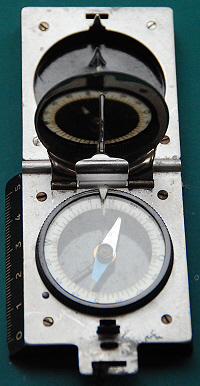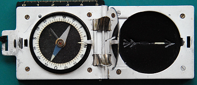Brunton Pocket Transit (combined compass and clinometer) by E R Watts & Son. The compass and clinometer are in good working order but the aluminium case has lost much of its paint and the lid is missing the mirror with its sight line, I have partially restored it since this photo was taken.